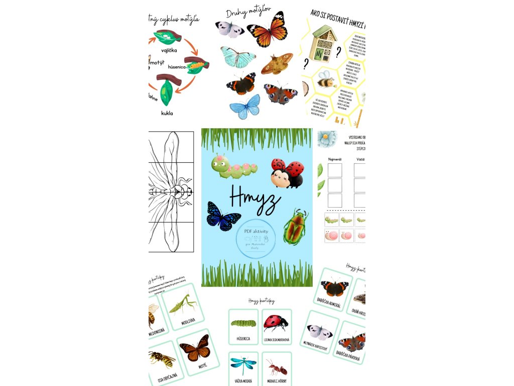 Obsahuje náučné kartičky s názvom hmyzu, pár pracovných listov, životné cykly, návod na postavenie hmyzieho hotela, hmyzie produkty...